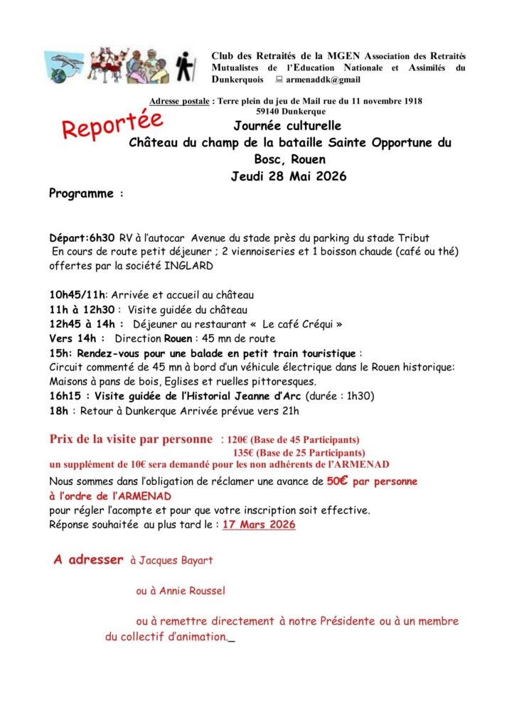 Club Association Retraite Marche Randonnée Belote Scrabble Dunkerque Voyage Jeux-de-Société Convivialité Retraités Balade Danse Journée-Récréative Cinéma Club. Le but de l’association est de regrouper les retraités et préretraités pour développer en groupe des liens d’amitié, de susciter des rencontres pour pratiquer ensemble des activités de loisirs, sportives et culturelles telles que la marche, la balade, des randonnées, du sport, des jeux de société (scrabble, belote…), de présenter une fois par mois une séance de cinéma, des voyages, des sorties, des après-midis récréatifs. Le club est basé à Dunkerque, Coudekerque Branche et englobe tout le dunkerquois.